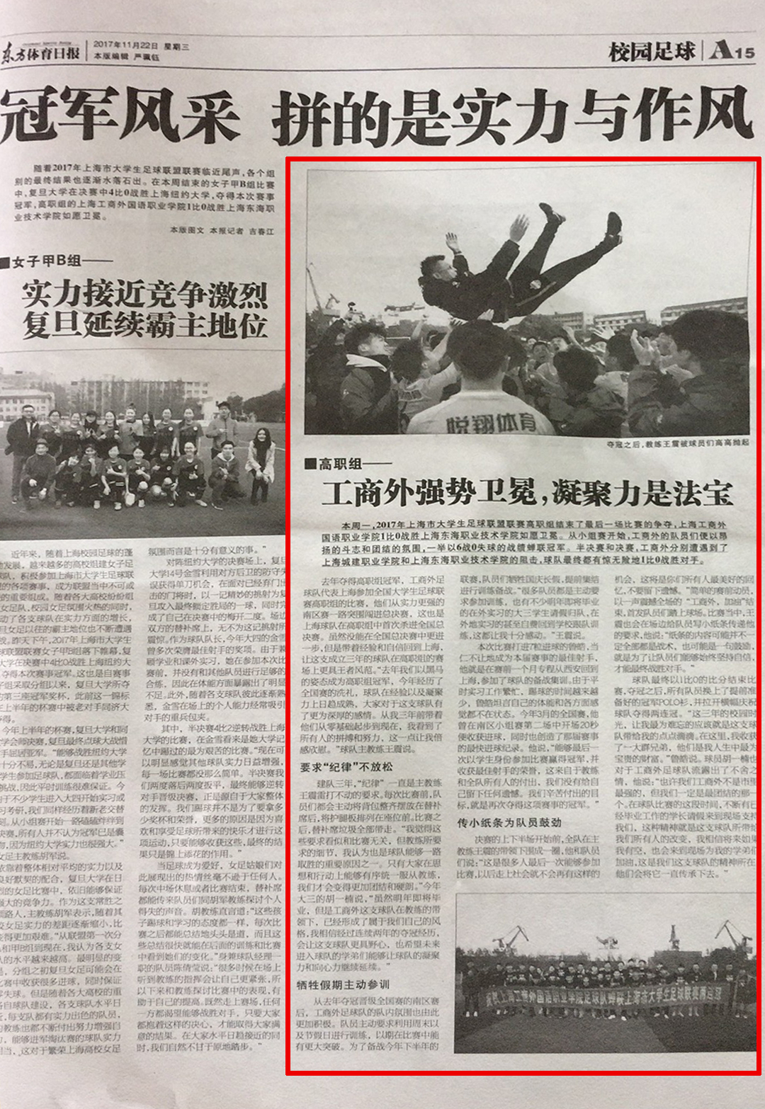 《东方体育日报》 2017年11月22日 A15版《工商外强势卫冕,凝聚力是法宝》 记者:吉春江 报道原文: 本周一,2017年上海市大学生足球联盟联赛高职组结束了最后一场比赛的争夺,上海工商外国语职业学院1比0战胜上海东海职业技术学院如愿卫冕。从小组赛开始,工商外的队员们便以昂扬的斗志和团结的氛围,一举以6战0失球的战绩蝉联冠军。半决赛和决赛,工商外分别遭遇到了上海城建职业学院和上海东海职业技术学院的阻击,球队最终都有惊无险地1比0战胜对手。