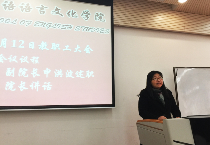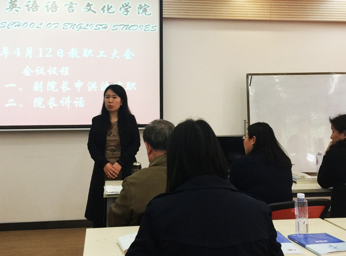 会议最后,陈诚副院长宣布了英语系教研室主任变更的决定。4月起,由孙辉和夏洋洋两位老师分别担任综合英语及综合能力训练的教研室主任。她代表全体教职员工,向原教研室主任曾玲和李冠群多年来的兢兢业业工作,表示了衷心感谢。同时,陈老师希望英语系全体教职员工继续支持、配合学院各项工作,尤其要结合三年创新发展行动计划的应用英语骨干专业建设及《综合英语》精品在线课程建设,把应用英语专业建设得更强、更有特色。