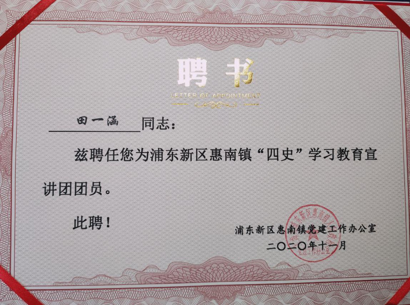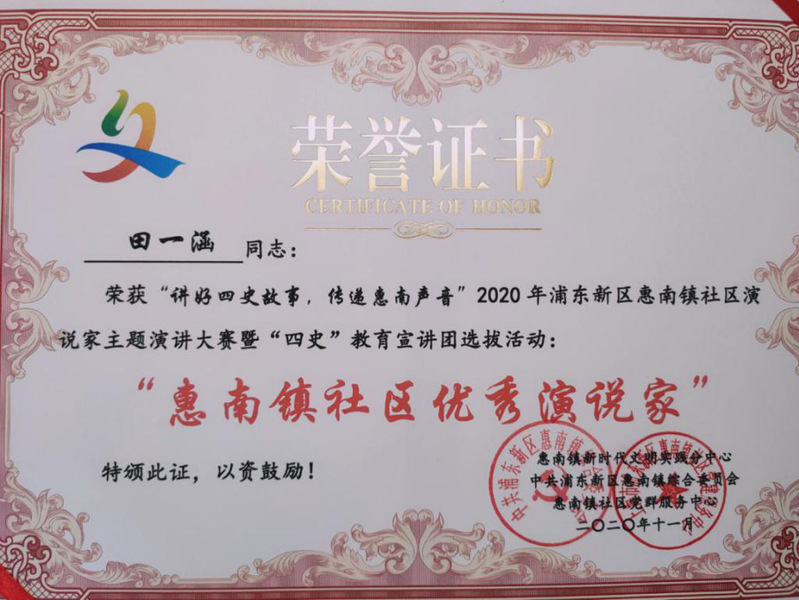 | “四史明初心,青春勇追梦”学校田一涵老师获“惠南镇社区优秀演说家”并成为浦东新区惠南镇“四史”学习教育宣讲团成员 |
