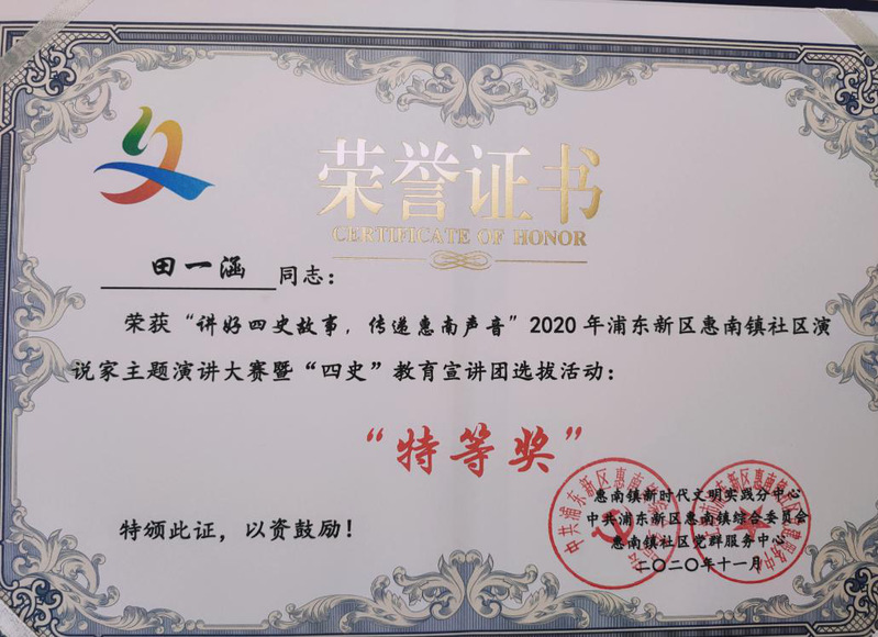 为深入开展“四史”学习教育,结合浦东新区“四史”教育工作整体安排,进一步推动“四史”学习教育常态化,弘扬社会正能量。由中共浦东新区惠南镇委员会主办“讲好四史故事,传递惠南声音”2020年浦东新区惠南镇社区演说家主题演讲大赛暨“四史”教育宣讲团选拔活动于2020年9月23日拉开帷幕。 上海工商外国语职业学院党委高度重视本次活动,积极组织各支部党员同志参加,经过商议,最终决定派出365电子竞技官网学生党支部书记田一涵参赛。 田一涵老师参赛作品为《四史明初心,青春永追梦》,该演讲结合学校特色,从《傅雷家书》入手,融入惠南镇历史文化及学校“四史”教育活动组织情况。讲述了一位大爱无声的父亲、认真执着的翻译家、满怀赤子之心的教育家的初心故事,讲述了一位党员,大学生辅导员,学生党支部书记的责任与使命。上海是中国共产党的诞生地和初心始发地,是共产党人梦开始的地方,这就要求我们要充分发挥红色资源优势、用活红色资源,引导学生深刻认识新中国来之不易、中国特色社会主义来之不易,坚定跟党走中国特色社会主义道路的理想信念。 经过初赛、复赛、决赛的激烈角逐,最终田一涵老师获得了“讲好四史故事,传递惠南声音”活动特等奖、惠南镇社区优秀演说家等称号,并顺利成为惠南镇“四史”学习教育讲团中的一员。通过本次“四史”教育活动,充分感悟到信仰之力、理想之光、使命之艰、担当之要,让我们一起用中国梦来激扬青春梦,不断从“四史”教育中汲取党性之力,让初心薪火相传。