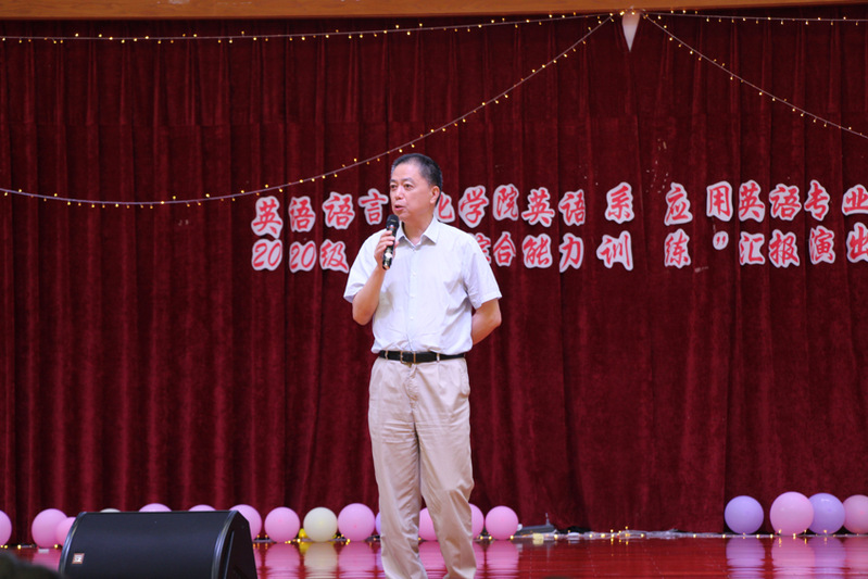 在热烈的掌声中,孔凡邨校长向全体师生致开幕词。致辞中,孔校长表示首先肯定英院学子在这一学期的各类比赛中所取得的优异成绩,感谢师生在过去的一学年对我院各项活动的参与和付出,并祝愿同学们在接下来的舞台上发挥个人所长,展示最好的自我。