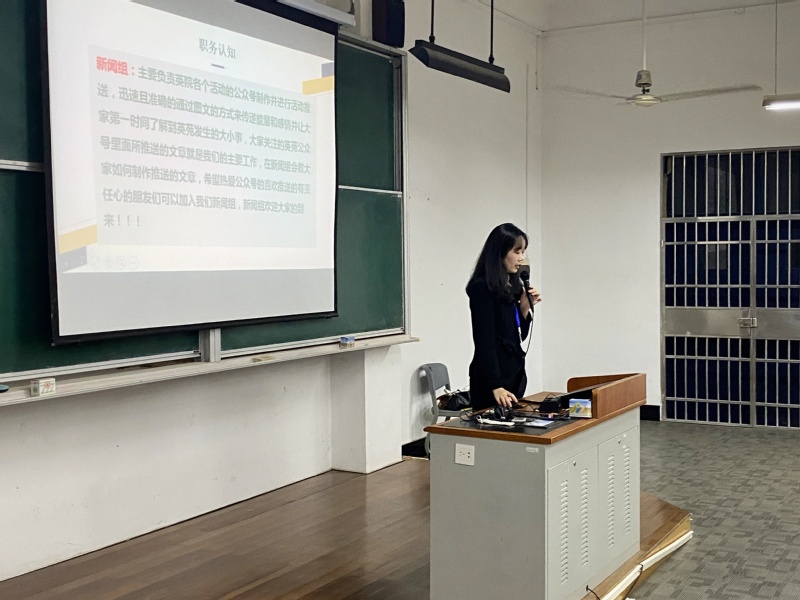 晚上六点,宣讲会正式开始。首先上台宣讲的是英院主席团成员。作为本次宣讲会的开场人,他们热情地向学弟学妹们介绍了英院分团委的总体情况以及基本职能。随后,各个部门的部长组长轮流上台宣讲。或严肃认真,或风趣幽默,向大一同学娓娓道来,阐述部门职能和工作理念,积极展示英院分团委学生会的风采。 各部部长介绍部门职能