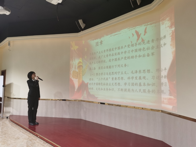 潮平两岸阔 风正一帆悬 仪式最后,新团员齐唱《共青团团歌》。激昂的团歌声仿佛让在场的所有人沉浸在一幅激荡百年的交响乐之中:广大青年在中国共产党的领导之下在革命、建设、改革不同历史时期接续奋斗、建功立业,全面建设新国家新社会。一幅百年的党史,涌现在大家的脑海中;一条全新的道路,在新团员们的脚下延伸。 青年兴则国兴 青年强则国强 共青团员是中国共产党的后备军,是中国先进青年的团体,向团组织靠拢的青年们更应该时时刻刻严格要求自己。新团员要明确新青年的使命,勇挑时代之担,继承并发扬“五四精神”,让个人理想在服务国家与社会建设中得到升华,不断奋斗拼搏。希望新团员在加入团组织以后,立足党的百年历史新起点,放眼于建国百年的新目标,更加自觉地以习近平新时代中国特色社会主义思想武装头脑,进一步增强“四个意识”、坚定“四个自信”、做到“两个维护”,坚定不移跟党走,成为一名有理想、有道德、有文化、有纪律的共青团员,实现中华民族伟大复兴中国梦贡献青春力量!
