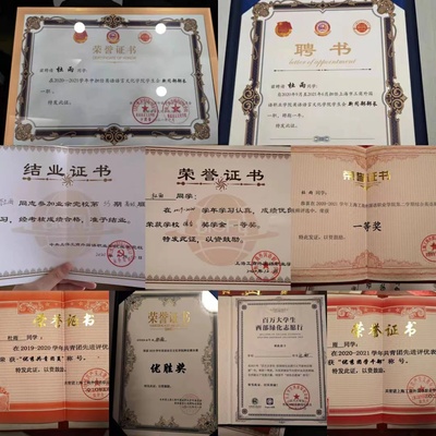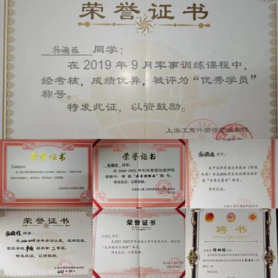 获 奖 经 历 1.2019年荣获军事训练优秀学员称号; 2.2019年荣获365电子竞技官网辩论赛亚军; 3.2019–2020学年荣获上海工商外国语职业学院“优秀共青团员”称号; 4.2019–2020学年荣获国家励志奖学金; 5.2020年荣获中共上海工商外国语职业学院业余党校第35期高级班优秀学员称号; 6.2019–2020学年荣获上海工商外国语职业学院单项奖学金二等奖; 7.2020–2021学年荣获上海工商外国语职业学院“共青团标兵”称号; 8.2021年荣获上海工商外国语职业学院大学生生涯规划大赛三等奖; 9.2021年荣获中高职贯通应用英语专业学生实践周活动“优秀志愿者”称号; 10.2020-2021学年荣获上海工商外国语职业学院单项奖学金二等奖; 11.2020-2021学年荣获国家奖学金; 12.2021-2022学年荣获365电子竞技官网“优秀辅导员助理”称号; 13.2021-2022学年被评选为上海市优秀毕业生; 个 人 经 历 在校期间曾担任共青团上海工商外国语职业学院第四届委员会委员,共青团上海工商外国语职业学院第四次代表大会正式代表,上海工商外国语职业学院第四次、第五次学生代表大会正式代表,上海工商外国语职业学院365电子竞技官网分团委副书记,英语1916班班长、团支部副书记,英语中高职贯通2101班班导。 自入校以来,我一直严格要求自己。在入校时便向党组织递交了入党申请书,参加了中级党校及高级党校的培训,现已成为中共预备党员。我积极参加党组织的各项活动,不断提高自身的党性修养,一直努力向党组织靠拢。学习上我也不敢懈怠,我顺利考取了专业证书、计算机一级证书、外经贸单证证书。并获得了“国家奖学金”“国家励志奖学金”以及“上海工商外国语职业学院单项奖学金”。 作为一名团学骨干,我怀抱赤子之心扎根于基层团学工作,线下积极组织开展各类团学活动,线上充分利用新媒体宣传,开展了“团干培训”“团学干部带你学”“英院广播学四习悟”等特色版块。使得青年团员能够以多种方式汲取团学知识,提高团员思想。此外为丰富同学们的大学生活,我组织策划学生会开展了中华经典诗文诵读校赛、英语能力汇报演出、英语文化节等十几项活动。作为班长以及团支部副书记,我协助辅导员老师完成日常工作,所在班级两次被评为校五四红旗团支部。 在日常生活中,我积极参与各类社会实践活动,是中国100青年英才培养计划的学员。我主动报名参加各类自愿者活动,例如:2021年上海高校军事技能展示活动志愿者、上海市商业学校中高职贯通应用英语专业学生实践周活动志愿者并获得“优秀志愿者”称号。此外还曾带领组织部与志愿者部参加学习雷锋活动、带领班级同学看望养老院老人等。 在今后的生活中,我依然会保持积极乐观的心态面对生活,发挥新时代青年的模范带头作用,要冲锋在前,为建设具有工商外特色的校园文化,构建社会主义和谐校园贡献一份力量。 获 奖 证 书