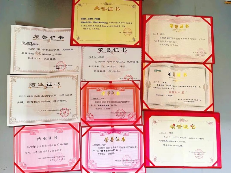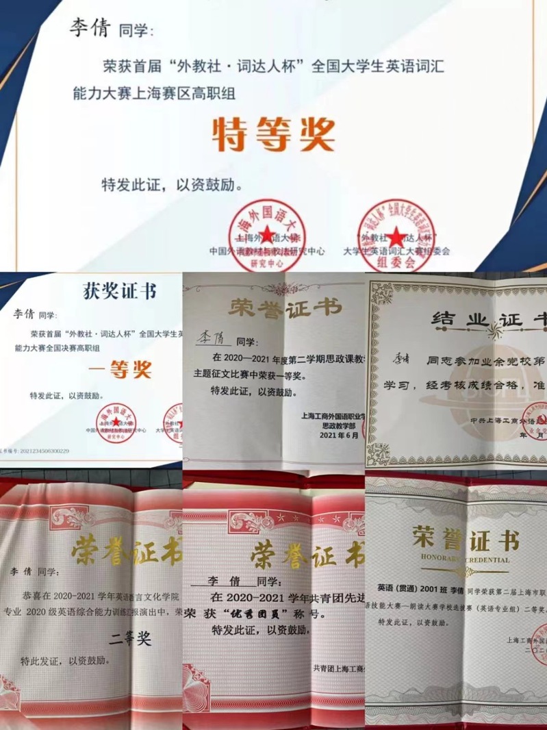 曾获荣誉 1.首届“外教社·词达人杯”全国大学生英语词汇能力大赛全国决赛 国赛一等奖;上海市(省)赛特等奖; 2.2020--2021学年第二学期《概论》课“回望百年路奋进新征程”纪念中国共产党百年华诞 主题征文 一等奖; 3.第三届长三角应用型高校“中国故事”英语视频大赛参赛作品校级二等奖; 4.“用英语讲中国故事”朗读大赛(2021)二等奖; 5.2020级英语综合能力训练汇报演出 二等奖; 6.第二届高教社杯上海市职业院校外语“朗读大赛” 二等奖; 7.上海市“星光计划”第九届职业院校技能大赛选拔赛 三等奖; 8.2021学年综合奖学金三等奖; 9.2021年第三十八期业余党校高级班优秀学员; 10.上海市优秀毕业生; 个人经历 自2020年10月份入校以来,我在各个方面严格要求自己,努力学好专业知识,积极参加学校组织的各项活动,注重综合能力的提高和发展,进步显著。中高职贯通班虽然在校只有两年时间,但这两年大学的培育,使我在思想上、学习上、工作上有所进步。 思想上,拥护党的领导和党的各项方针政策,关注时事政治。学习党的理论知识,以党员标准严格要求自己,全心全意为同学们服务,积极向党组织靠拢。在校期间参加了业余党校中级、高级党校的学习,2021年第38期业余党校高级班获得优秀学员荣誉称号。在校期间,我参加“回望百年路奋进新征程”纪念党百年华诞主题征文并获得一等奖。 在学习上,学习刻苦,态度端正,获得了绩点3.75的好成绩,在班级名列前茅。在校期间取得了多种英语专业证书,高分通过英语四六级、中级口译、BEC中级等多项考试,并于2020-2021学年获校级综合三等奖学金,作为英语专业的学生,精通词汇,曾获得首届词达人杯国赛一等奖、省赛特等奖。多次参加校英语口语大赛,获得两届“用英语讲中国故事”朗读大赛二等奖,校“星光计划”第九届职业院校技能选拔赛三等奖。第三届长三角应用型高校“中国故事”英语视频大赛校级二等奖。代表年级参加英语综合能力汇报演出获得二等奖。作为一位英专生,我全面发展和专业相关的技能。在学好本专业知识的同时广泛涉猎,提高自身素质。 在工作上,担任班内心理委员一职,有较高的组织协调能力。举办班中心理健康为主题的主题班会,关注大学生健康成长。生活态度积极,本着认真负责的态度积极完成各项工作,是同学们优选的听诉者,帮助解决同学在生活上、学习上焦虑情绪等。生活中团结同学,乐于助人,群众基础良好,得到老师和同学们的广泛认可,获得了2021年以及2022年“优秀团员”称号。同时参加了校志愿者部,大专两年贡献了校内校外多次志愿者活动。 无论是在思想、学习、还是工作上,我都以高标准要求自己,持之以恒、积极向上,争做一名全面发展的优秀学生。 获奖证书