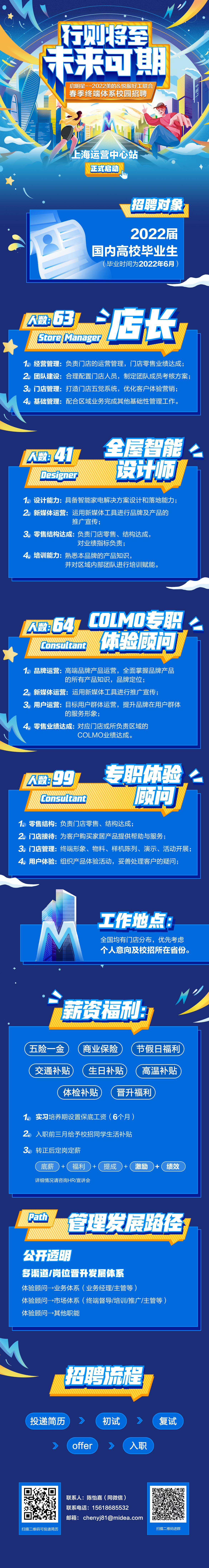上海斯佩克财务咨询公司 隶属上海石油化工交易中心,并由上海市财政局批准,具有代理记账资质和专业财务公司 专为“上海石油化工交易中心”所属企业 从事代理记账,财务咨询,财务统计和协助办理涉税等服务 现招聘财务人员4人 学历要求大专及以上(财务会计专业或有会计从业资格证书优先) 实习薪资4500元/月,正式入职后薪资调整为5500~6000元/月 岗位基本要求: 学习和适应能力强,熟练使用办公软件 向客户开具发票等 有意向学生投递简历邮箱:316853914@qq.com 美的集团上海运营中心 Midea 广阔平台,优质岗位 启明星-2022春季终端体系校园招聘 欢迎志同道合者加入! 行则将至,未来可期 简历投递邮箱:chenyj81@midea.com 联系方式:陈怡嘉 15618685532(微信同号)或扫描海报底部二维码进群咨询