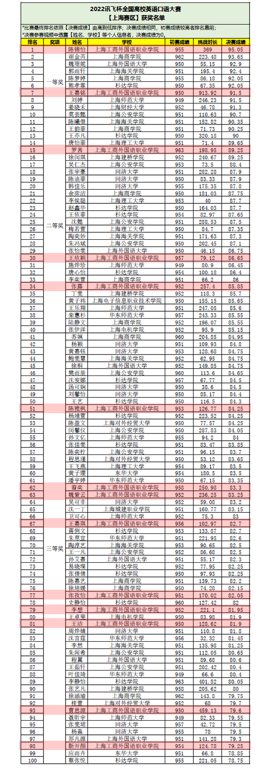 近日,2022年“讯飞杯”全国高校英语口语大赛上海赛区决赛落下帷幕,我校积极组织学生参赛,最终在上海赛区中脱颖而出,喜获佳绩,荣获一等奖2人、二等奖3、三等奖9人。其中,英语2001班陈锦怡同学(指导教师:李锦)获上海赛区冠军,并将代表上海参加下半年的全国巅峰对决赛(上海赛区前两名入围)。