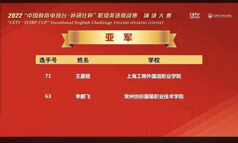 英院学子王嘉铭过关斩将,夺全国演讲大赛特等奖亚军! 12月18日讯,在刚刚结束的2022“中国教育电视台·外研社杯”职场英语挑战赛演讲大赛全国总决赛中,我院中高贯通2103班王嘉铭同学不负众望,在激烈角逐中荣获全国特等奖亚军,为校争光。