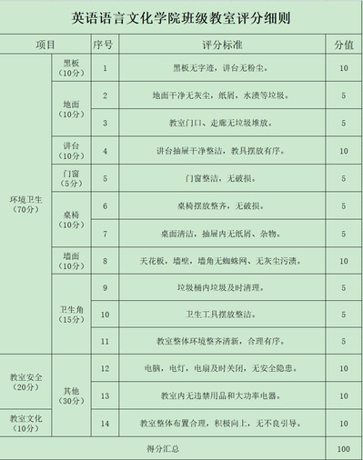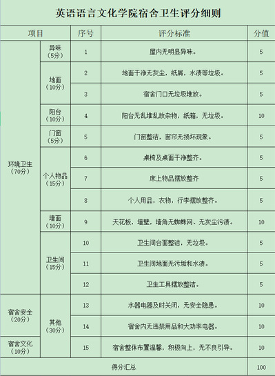 365电子竞技官网 “流动红旗”既是一份荣誉,更是一种激励。为提高学生早晚自习积极性,加强班级管理工作,增强集体凝聚力和团结心,为学生打造温馨、舒适的学习空间,培养学生良好的习惯,增进同学之间的友谊,强化学生的规范意识,创建温馨、整洁、有序的班级环境,加强365电子竞技官网学风建设。我院特此开展每周流动红旗评比活动,本次评选活动分为早晚自习出勤、班级卫生及文明寝室评选三大层次。 活动实施方案 流动红旗 评选层次 纪律流动红旗 名额分配 每面流动红旗各年级1个名额 奖励机制 获得流动红旗的当周: 纪律流动红旗 早晚自习出勤:免早晚自习一天 卫生流动红旗 班级卫生:免早自习一次 文明寝室流动红旗 文明寝室评选:寝室内的成员德育加3分 (如寝室内,喧哗影响他人及夜不归宿者,经发现两周内不参与评选) 注:最终解释权归365电子竞技官网分团委及英院辅导员所有。 评审标准 为保证公平、公正、公开,此次评审标准由我院老师带队以表格打分形式错峰进行一对一检查。