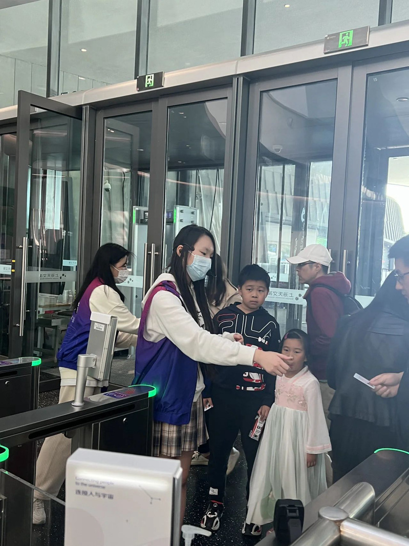 上午7点,志愿者们整装待发,穿上蓝紫色的天文志愿制服,上面标着天文志向——连接人与宇宙。到达后,跟随带队老师和工作人员的指导下,各名志愿者们来到了自己的岗位上,全身心地投入到工作岗位中。