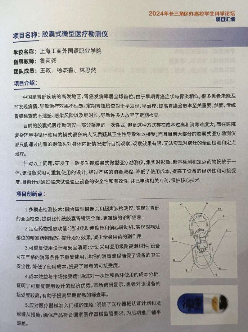 他们的项目作品《胶囊式微型医疗勘测仪》,在此次科学论坛中获得优胜奖。